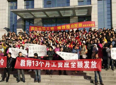 本來高中老師的工資就不高,工資還被克扣生活壓力就更大了。不得已,教師們只好集中在政府門前進行抗議。