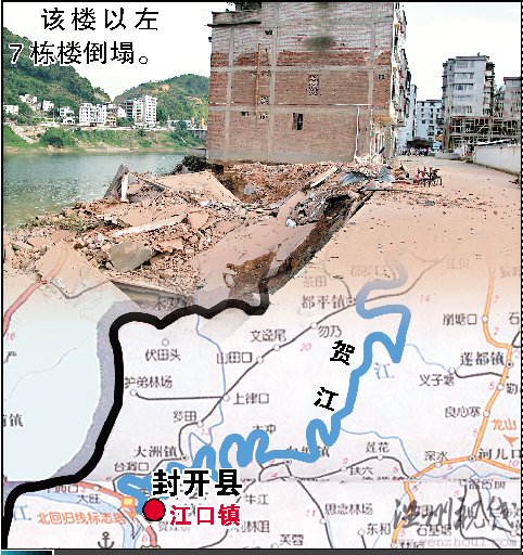 昨日下午4時(shí),位于封開縣江口鎮(zhèn)舊城區(qū)東方二路賀江一橋至江口鎮(zhèn)實(shí)驗(yàn)廠原職工宿舍樓河岸路段發(fā)生滑坡地質(zhì)災(zāi)害,導(dǎo)致該區(qū)7棟居民樓房倒塌落入賀江中,所幸沒有造成人員傷亡。