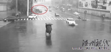 監控錄像顯示:5月20日中午,天下著雨,溫州市區信河街上的車輛并不多。12點06分,一輛黑色的奔馳轎車突然轉向非機動車道,撞到一名騎自行車的男子。該男子騰空約2米高,先落在了旁邊一輛三輪車的頂棚,繼而彈到地上,一動不動。此時,黑色奔馳車非但沒有停車,反而加速逃逸。