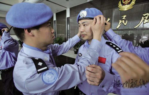 昨天,民警徐業(yè)(左)正在為隊友吳曉兵整理警容。當(dāng)天,市公安局舉行出征儀式,歡送我市8名警官赴非洲利比里亞執(zhí)行為期一年的維和任務(wù)。這是自2005年我市開始向利比里亞、東帝汶選派維和警察以來,人數(shù)最多的一次,他們將在維和地區(qū)開展治安巡邏、處理糾紛、維護社會秩序等工作。
