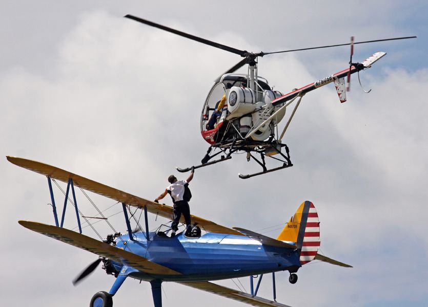 美國特技當場摔死:當地時間8月21日,出身特技世家美國特技演員Todd Green在密西根州的飛行表演時,表演從雙翼飛機上爬回直升機,特技演員Todd Green已經從直升機上成功爬到雙翼飛機,并且向觀眾揮手,在飛機上試圖行走特技演員失足摔落,當場摔死,將近8萬人目睹了這一慘劇,飛機在飛行過程中,特技演員Todd Green在飛機背上受到的空氣阻力相當大,稍有不慎失足就很危險,況且特技演員Todd Green可能太自信,沒有降落傘,那就是死亡。據悉Todd Green從約200英尺(60.96米)的高度摔下,并且在地上反彈了多次。圖為Todd Green從直升機轉移上雙翼飛機。